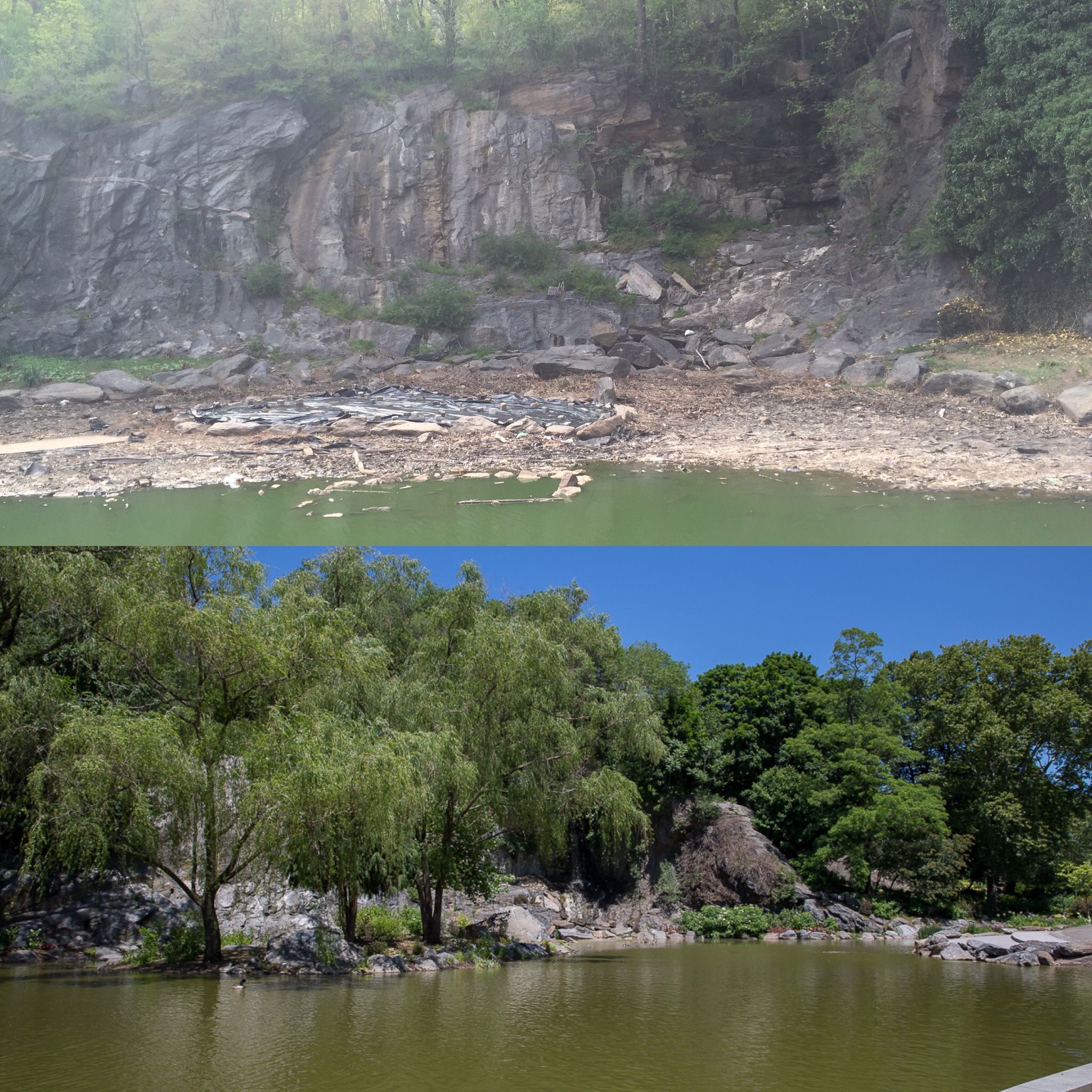 Before and after photos (click to enlarge), presented in split screens by Julia Boland, show the progress of the CGC Centennial project in Morningside Park.